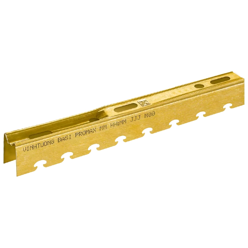 Thiết kế lỗ treo ty thế hệ mới: Thanh chính BASI PROMAX được cải tiến với các lỗ treo ty (lỗ móc treo) cỡ lớn và dài hơn thiết kế cũ, giúp thợ thi công dễ dàng căn chỉnh vị trí treo khung linh hoạt hơn. Các lỗ này được bố trí sẵn dọc thân thanh với khoảng cách hợp lý, hạn chế việc phải khoan đục thêm lỗ mới (vốn làm suy giảm lớp mạ bảo vệ và có thể gây điểm rỉ sét). Nhờ thiết kế thông minh này, việc treo ty ren liên kết khung trần vào kết cấu trần bê tông trở nên nhanh chóng và chắc chắn hơn, đồng thời bảo toàn được lớp mạ chống rỉ tại các vị trí lỗ treo.